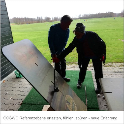 GOSWO bietet dem sehenden und sehbehinderten Golfer eine Referenzebene bzw. einen Referenzkorridor. Beide Golfer können den Golfschwung nicht mit den Augen verfolgen, jedoch erhalten beide Golfer eine Rückmeldung bei Berührung. Da der blinde Golfer sich jedoch mehr auf seine Bewegung konzentriert, entsteht ein viel größerer und schnellerer Lerneffekt. Hier können sehende Golfer von Blindengolfern etwas lernen. Sehr oft hört man den Ausspruch: „Das mache ich blind“. Na dann versuchen Sie mal einen Aufschwung im GOSWO-Korridor mit verbundenen Augen. Sie werden staunen, wie das misslingt.